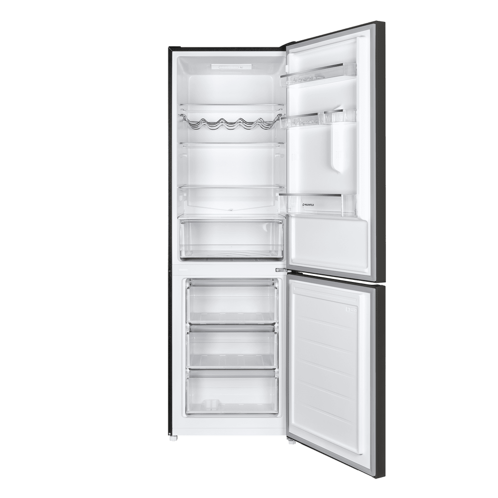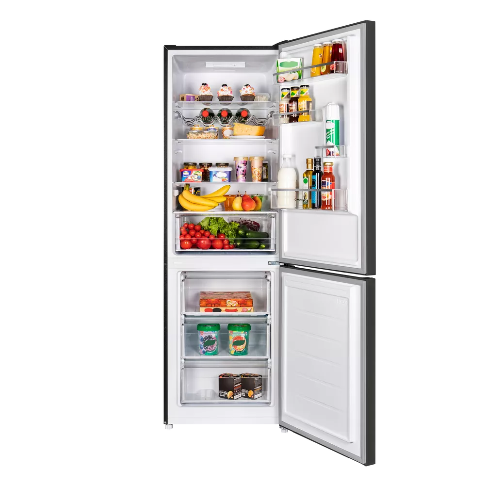 Двухкамерная конструкция с верхней холодильной (213 л) и нижней морозильной (104 л) камерами обеспечивает продуманную организацию хранения. В холодильном отделении предусмотрены стеклянные полки с металлической окантовкой, большая корзина для фруктов и овощей, боковые полки на дверце, решетка для бутылок и лотки для яиц. Низкий уровень шума 39 дБ делает MAUNFELD MFF185SFSB комфортным для кухни-гостиной.
