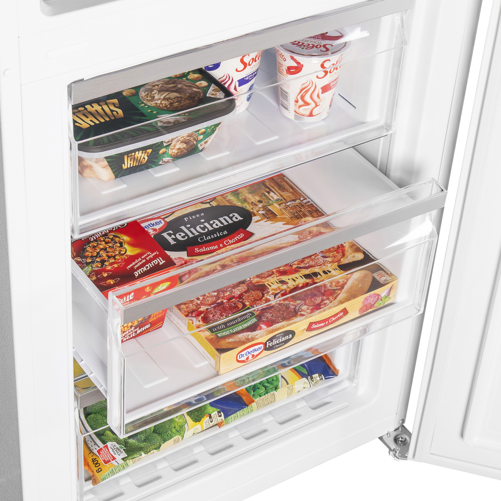 Общий объём 340 литров оптимально распределён между холодильной и морозильной камерами. В холодильнике вас ждут удобные стеклянные полки с окантовкой, большие корзины для овощей и фруктов, боковые полки на двери и решётка для бутылок; в морозилке — три выдвижных ящика и формочка для льда. На передней панели расположен сенсорный дисплей с быстрым доступом к режимам «Быстрая замораживание», «Отпуск» и «Смарт ЭКО».