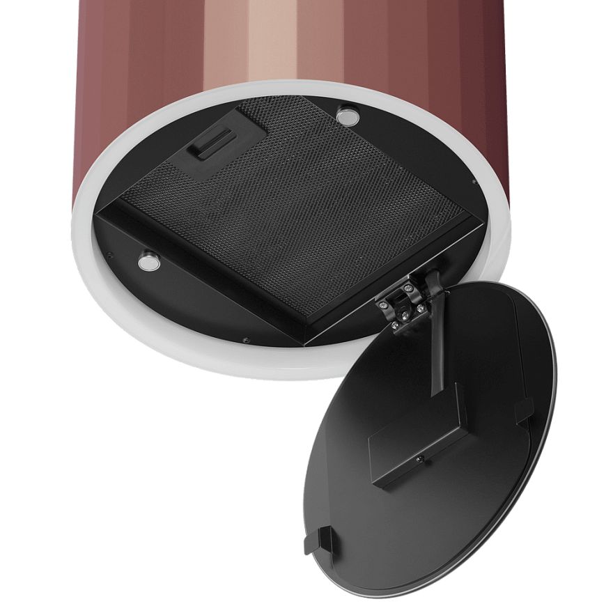 Дизайн вытяжки эффектно выделяется рельефными полосами вдоль цилиндрического корпуса и запоминающейся стеклянной панелью, выполненной в соответствии со всеми тенденциями рынка бытовой техники.