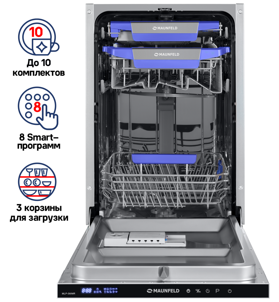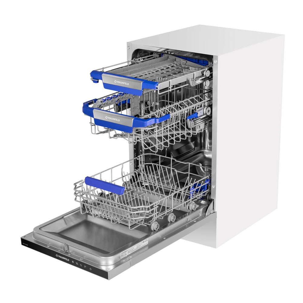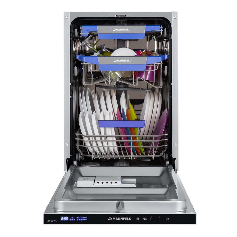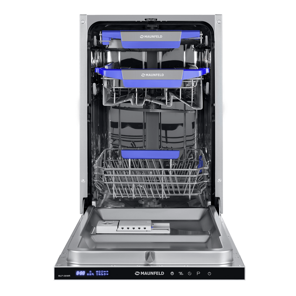 Узкая встраиваемая посудомоечная машина MAUNFELD MLP-08IMR бережно экономит место на кухне: корпус шириной 45 см легко вписывается в стандартный шкаф, а фасад остается аккуратным и цельным.