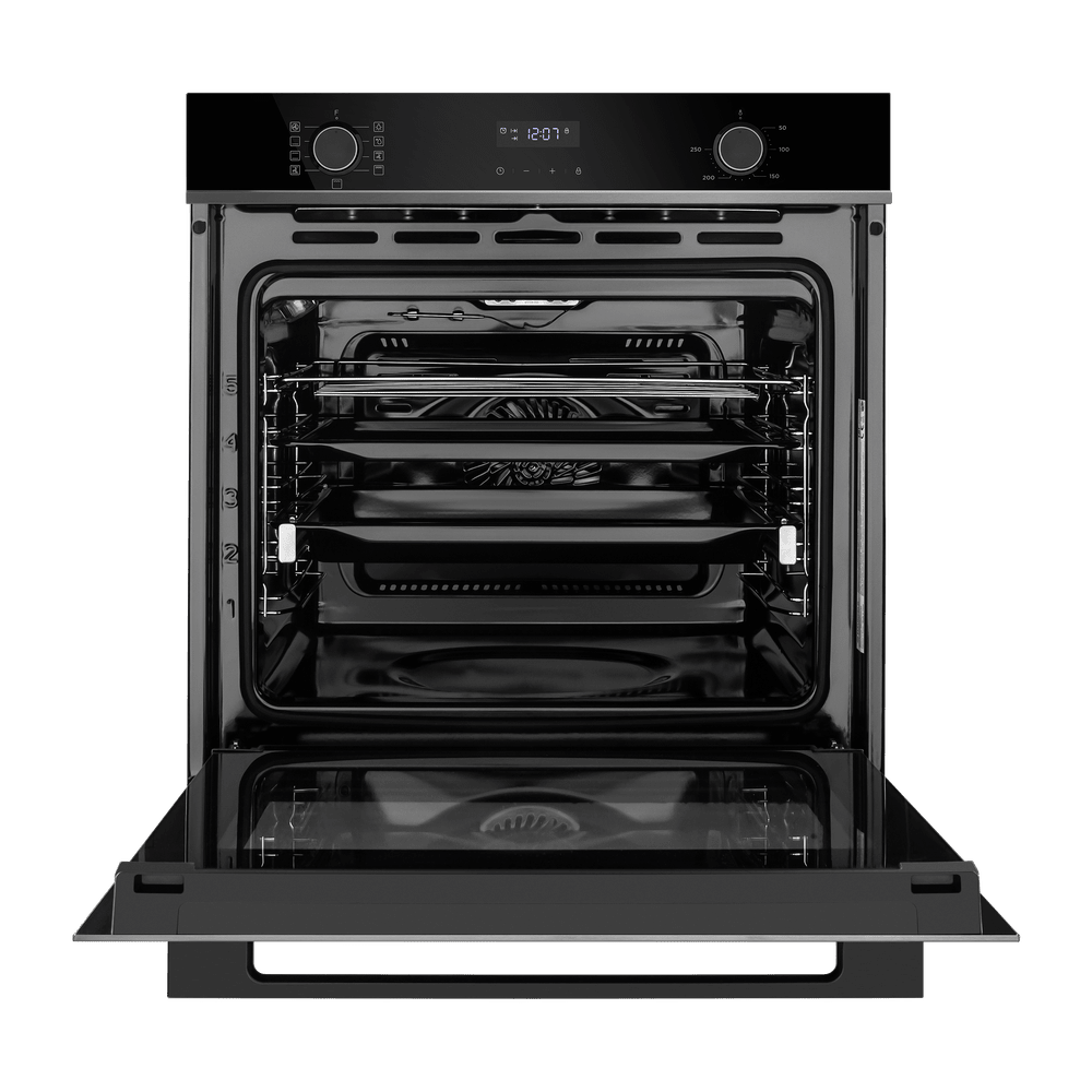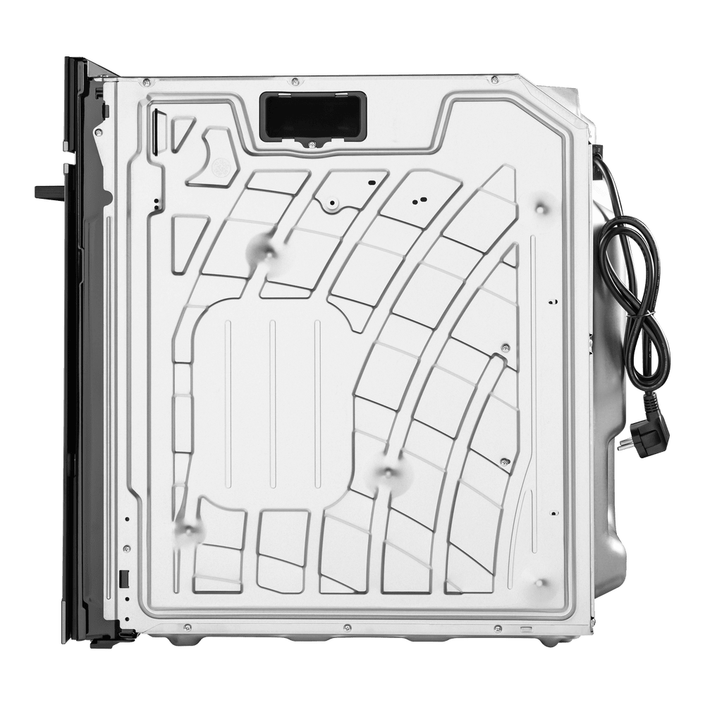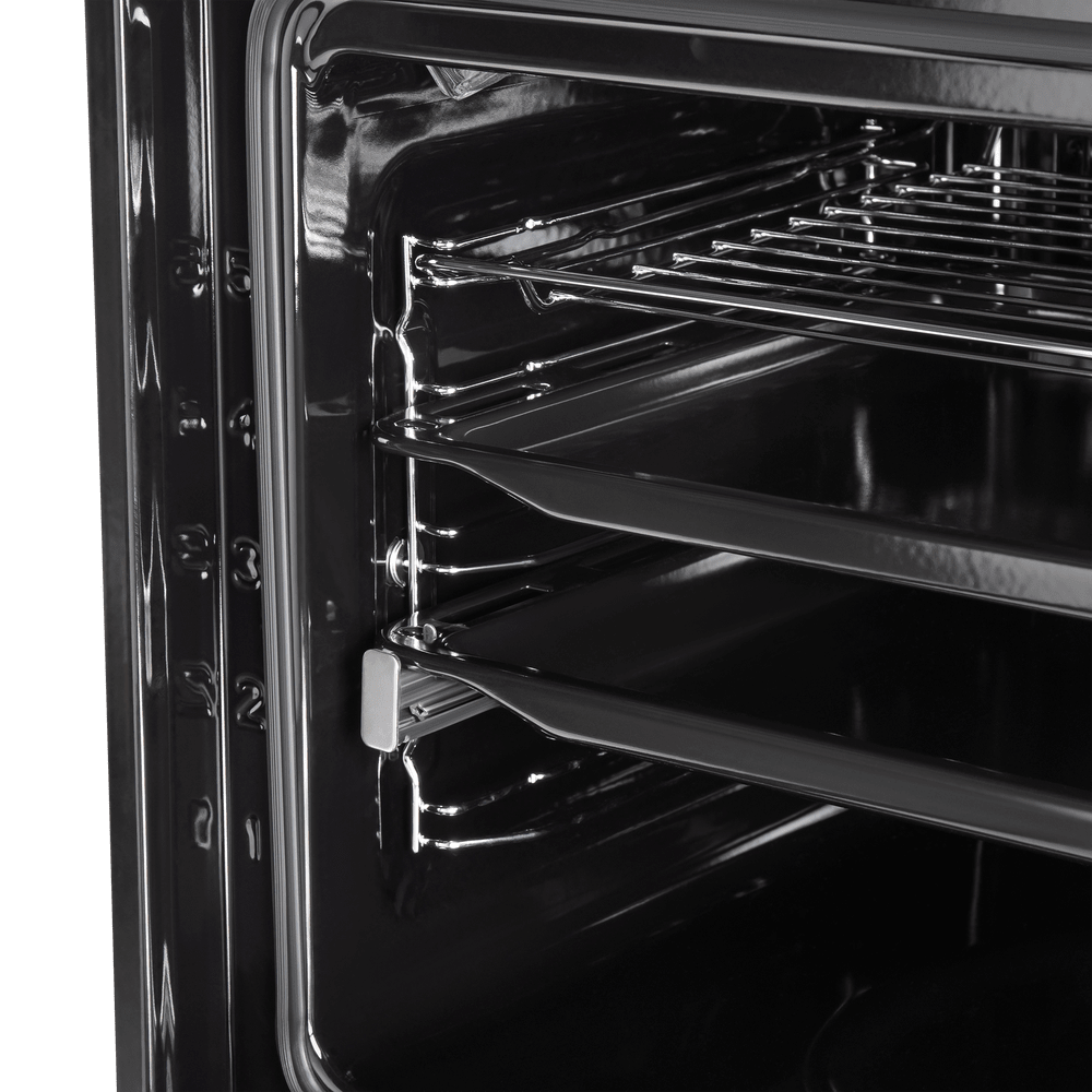 В отделке блока управления используется жаропрочное стекло, которое не выцветает и не боится высоких температур, сохраняя презентабельный вид на долгие годы. Внутреннее покрытие выполнено эмалью легкой очистки: осевший жир легче удаляется, поэтому уход за духовкой не отнимает много времени. Телескопические направляющие и хромированные элементы добавляют удобства при ежедневной эксплуатации.