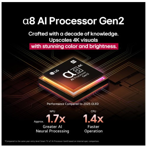 Оснащен мощным интеллектуальным процессором α9 4K Gen2 с 4 ядрами, использующим искусственный интеллект для улучшения изображения и звука. Встроено 10 режимов изображения, поддержка высокого частотного режима HFR (120 кадров в секунду через HDMI и USB), а также технология OLED Motion для плавного движения.
