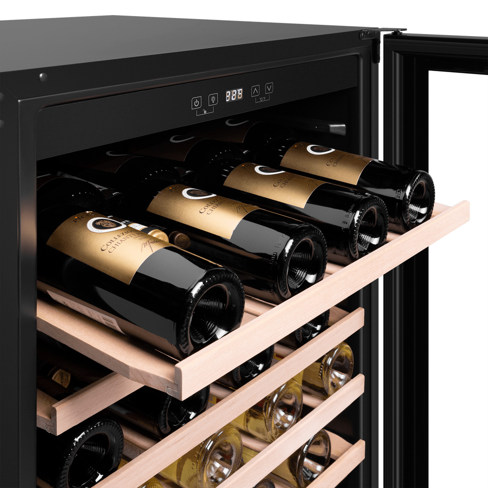 Компрессорная система с вентилятором равномерно распределяет холодный воздух, а дверца из тонированного стекла с УФ-защитой надёжно сохраняет качество вина. Внутренняя LED-подсветка делает коллекцию стильной и заметной.